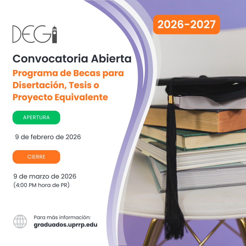 El Decanato de Estudios Graduados e Investigación (DEGI) convoca a los/as estudiantes que cursan su último año en el grado de maestría (en los cuales no exista un grado doctoral) o estudiantes en el grado doctoral en el Recinto de Río Piedras de la Universidad de Puerto Rico para solicitar a la Beca para Disertación, Tesis o Proyecto Equivalente (PBDT). La otorgación de esta beca está sujeta a la asignación de fondos para el año fiscal 2026-2027, la elegibilidad de los solicitantes y la puntuación obtenida de la evaluación de las evidencias presentadas para cada uno/a de los solicitantes. Además, su otorgación está sujeta a los costos de estudios establecidos por la Institución, por lo que afecta la participación de préstamos estudiantiles y otras ayudas.